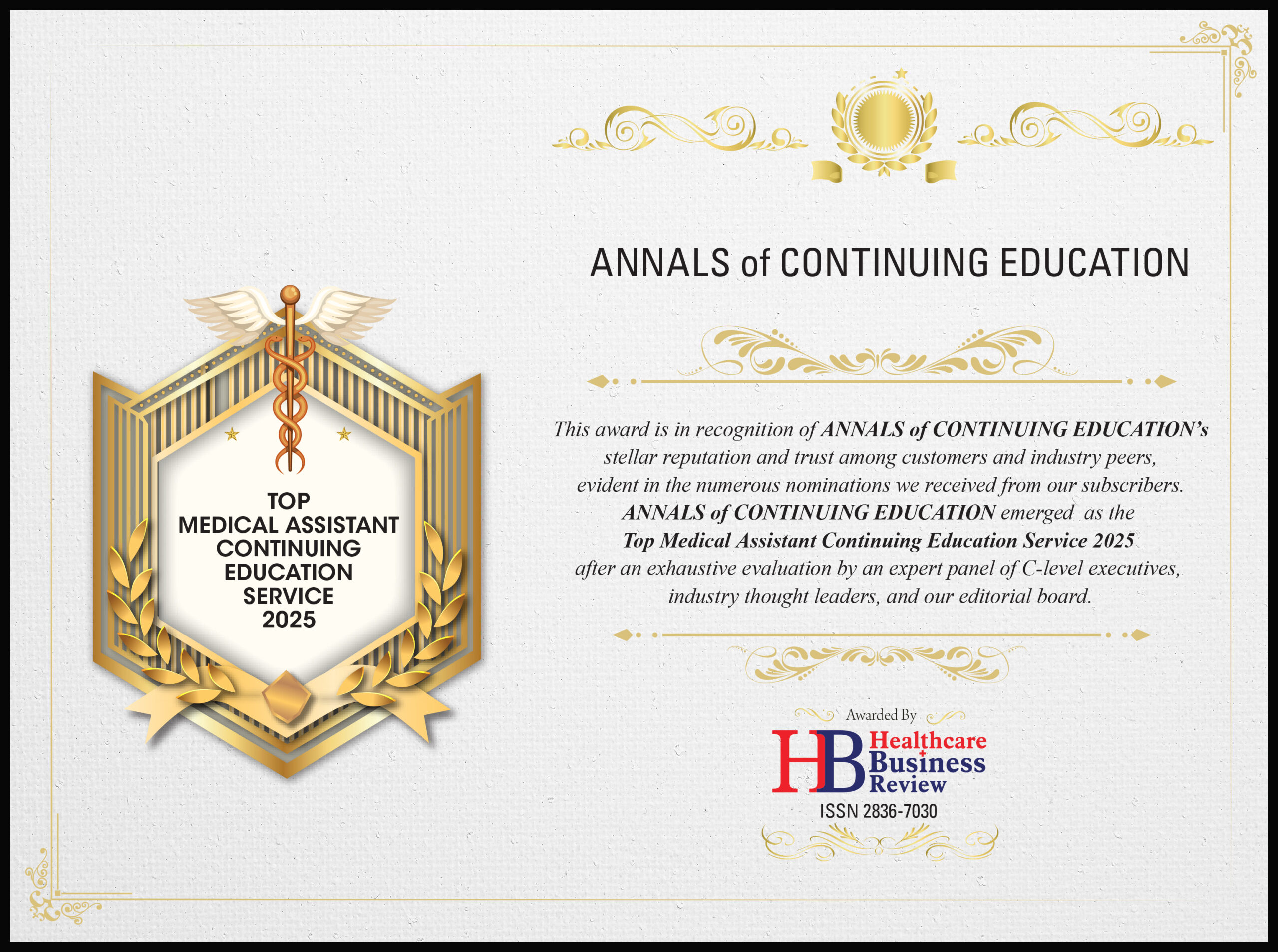 ANNALS of CONTINUING EDUCATION® (ACE) has been named the Top Continuing Education Service for Medical Assistants in 2025! This incredible honor from Healthcare Business Review recognizes our commitment to excellence and the trust our members place in us.